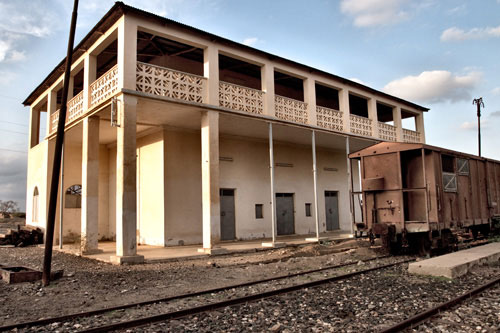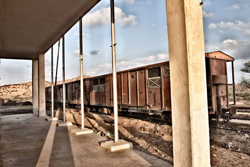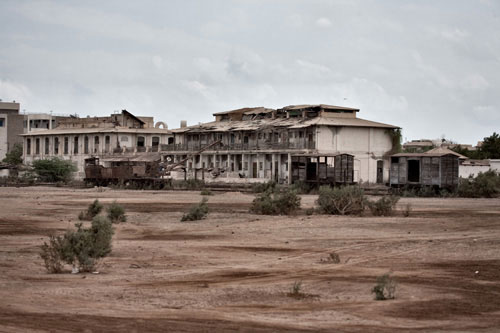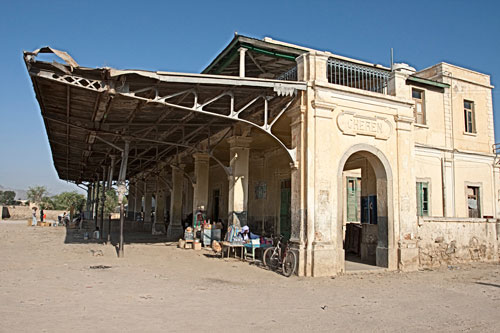 stazione di MASSAUA Il susseguirsi di emozioni e sorprese che ci hanno accompagnato fino all'ultima stazione, quella più importante, quella che un tempo era il punto di partenza del treno diretto ad Asmara è ormai a portata di mano. Era qui che che approdavano le navi provenienti dall'Italia pronte per essere scaricate. Era qui che venivano caricati file di vagoni che presto avrebbero attraversato la piana desertica per raggiungere il bassopiano fino a Ghinda e poi salire ripidi fino ad Asmara. Il nostro viaggio attraverso le stazioni sta per terminare. Il susseguirsi di emozioni che ci hanno accompagnato fino a questo punto ci sta riservando l'ultima, la più attesa delle sorprese: la stazione di Massaua. Attraversiamo il ponte che conduce sull'isola di Taulud, costeggiamo il palazzo del governatore ridotto ad un cumulo di macerie per via dei bombardamenti, ci imbattiamo in una pensilina stile liberty in ferro battuto, con molta probabilità era la prima sosta del treno e ci dirigiamo verso la stazione. E' qui che terminano bruscamente le nostre illusioni perchè a differenza delle altre stazioni, quella di Massaua è ormai in totale decadenza. Occupata da diverse famiglie che vi vivono dentro, quella che un tempo era una meravigliosa stazione dall'architettura sopraffina, oggi è un cumulo di macerie miracolosamente in piedi. La conclusione del viaggio è delimitato dalle due rotaie piegate verso l'alto. Fine del viaggio!! In sottofondo sembra di udire il fischio del capostazione. E' il vento che si incanala attraverso le mille fessure o forse è la fantasia che continua a volare e a sognare per lei un destino diverso.