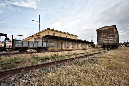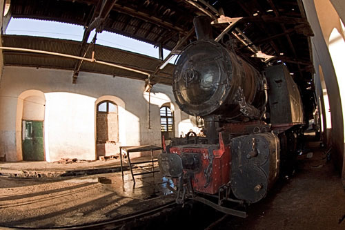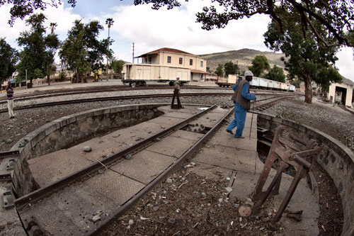 stazione di GHINDA Lasciata Nefasit dopo alcuni chilometri percorsi scendendo a capofitto verso il bassopiano raggiungiamo la cittadina di Ghinda ma con enorme stupore abbiamo qualche problema a ritrovare i segni della strada ferrata. Le rotaie le avevamo perse di vista pochi chilometri prima. Chiediamo informazioni quasi con timidezza per paura di ricevere risposte inattese. La stazione ci dicono, si trova poco fuori il paese e per raggiungerla percorriamo un breve tratto di sterrato sul quale corrono rotaie erose dal tempo. La prima sensazione è che da questo momento le nostre speranze possano ricevere brutte sorprese. La netta percezione di abbandono è sempre maggiore ma la stazione di Ghinda è comunque un piccolo gioiello architettonico. Si trova anche un deposito per il rimessaggio e uno scambio circolare per invertire la rotta del treno. Ci viene incontro l'anziano custode che con grande orgoglio ci mostra il perfetto funzionamento dello scambio.