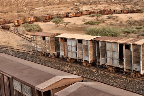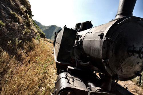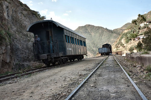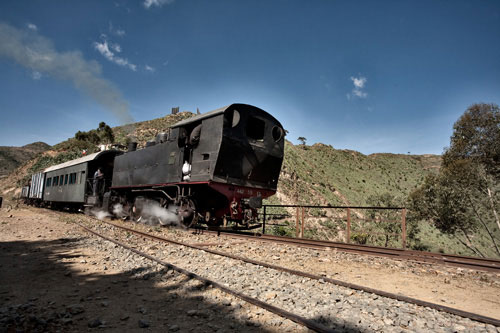 Asmara, la sua stazione, uomini che sembrano lì da sempre, il cielo azzurro, il vapore che esce dal fumaiolo, le motrici più nuove di quando vennero trasportate in terra Eritrea un giorno lontano di un anno vicino al 1920 e affascinanti carrozze da sembrare modellini. Poi via a seguire la strada ferrata che dai 2540 metri di Asmara scende a picco fino alle coste del Mar Rosso. La ferrovia offre scenari e panorami di incomparabile bellezza che non vengono affatto disturbati dall’affannato trenino: la strada ferrata si snoda in un seguito temerario di curve, controcurve, ellissi, gallerie, loopings, con i quali ritornava al punto di prima, ma più in alto, guadagnando così di quota. Salendo, le locomotive ansimano sempre più penosamente, mentre lo sferragliare del treno prorompe altissimo come un muggito metallico nei passaggi lungo le tagliate dei rupi e si dirada invece sui viadotti per poi disperdersi dentro le gallerie.