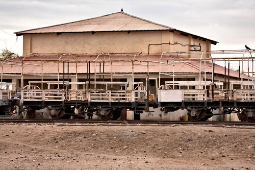 stazione di MAIA TAL Sarà per via dell'ora, sarà per lo straordinario ambiente circostante, sarà perchè mi sono abituato a stupirmi sempre in meglio ma questa stazione mi ha lasciato senza fiato. Raggiungiamo la stazione di Maia Tal con le lunghe ombre della luce del tramonto che modellano ogni minuscolo dettaglio. A differenza delle precedenti la sua architettura è estremamente razionale, essenziale. Semplicemente perfetta. La luce la modella in tutti i suoi dettagli ai miei occhi appare come un miracolo architettonico nel mezzo di una piana desertica dove non esiste altro che la stazione e i suoi binari. Naturalmente non vi è traccia umana se non quella delle lunghe file di cammelli e cammellieri che seguono i binari per andare chissà dove. Ho la netta impressione di trovarmi a fare parte della sceneggiatura di un film ambientato nel Far West, anzi sono proprio nel Far West. Infinite file di vagoni si perdono all'orizzonte. Mi domando da quanto tempo si trovano lì. Forse da sempre. Vagoni senza età che si perdono negli assolati orizzonti desertici della piana di Maia Tal.