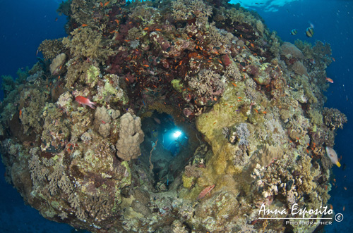 Un bellissimo blocco di corallo con un buco al centro attira la mia attenzione, lo guardo con interesse e mentre sono alla ricerca del miglior scatto, noto che Luca si trova esattamente dalla parte opposta e posso intravedere attraverso il buco, i fari della sua macchina fotografica ed ecco che la mia prima foto creativa prende forma.... mi piace!