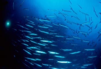 con un grande branco di barracuda che, quasi apparso dal nulla, sembra volare sopra